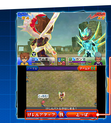 化身アームドの選手同士がぶつかるとアームドバトルが始まるぞ!下画面のアイコンからコマンドを選ぼう!けしんアタック:相手の化身を攻撃して相手のKPを削るぞ!但し相手が化身発動時・化身アームド時にしか使用できないぞ。技:選手が覚えている必殺技を発動!もちろん通常状態より格段に威力が強化!とっぱ:通常コマンドと同じだ!