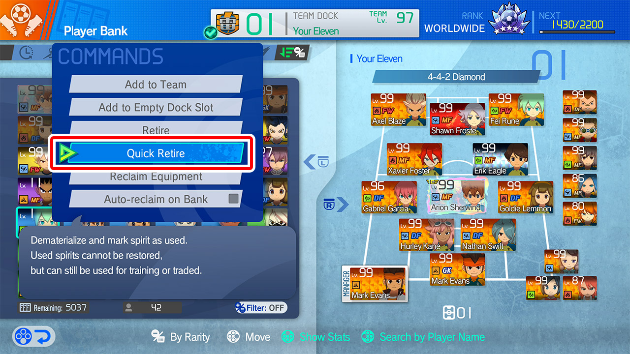 - ● Added a feature that allows multiple selected characters to be retired at once from the Player Bank.