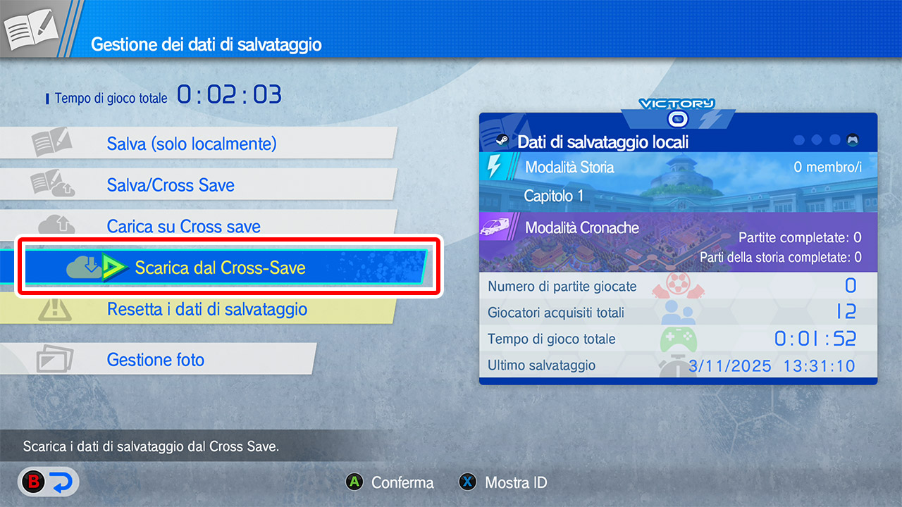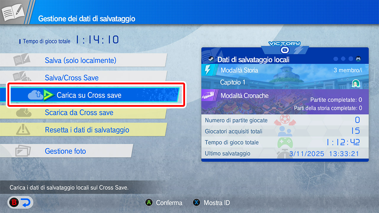 Dal menu "Gestione dei dati di salvataggio", seleziona "Carica su Cross Save" e segui le istruzioni.