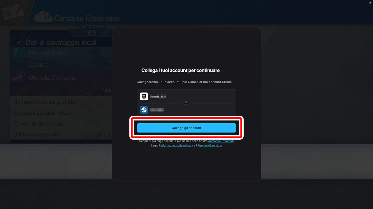 Collegando il tuo account Epic Games, potrai utilizzare il Cross Save tra diverse piattaforme.