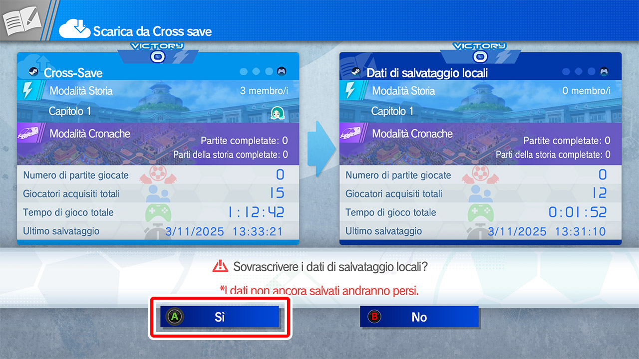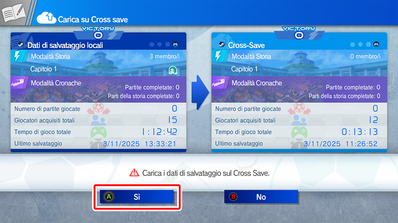 Quando appare il messaggio "Carica i dati di salvataggio sul Cross Save", tieni premuto il pulsante per selezionare "Sì".