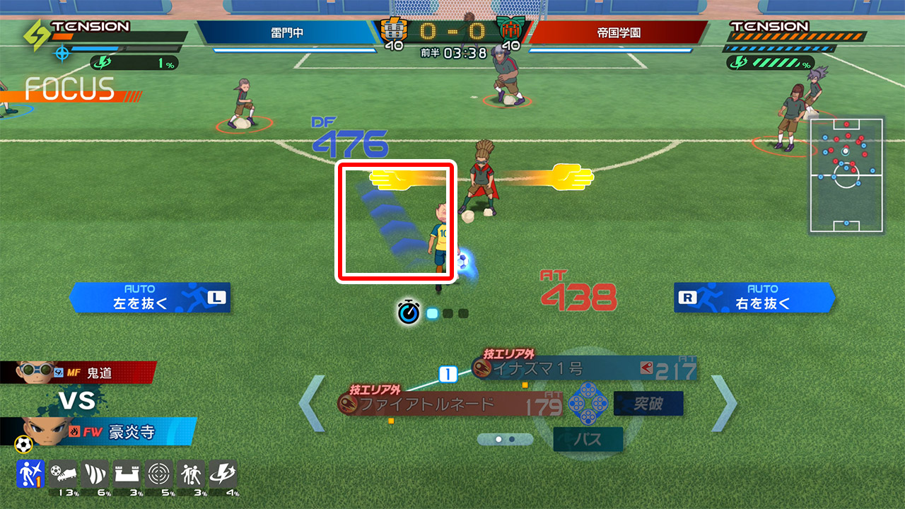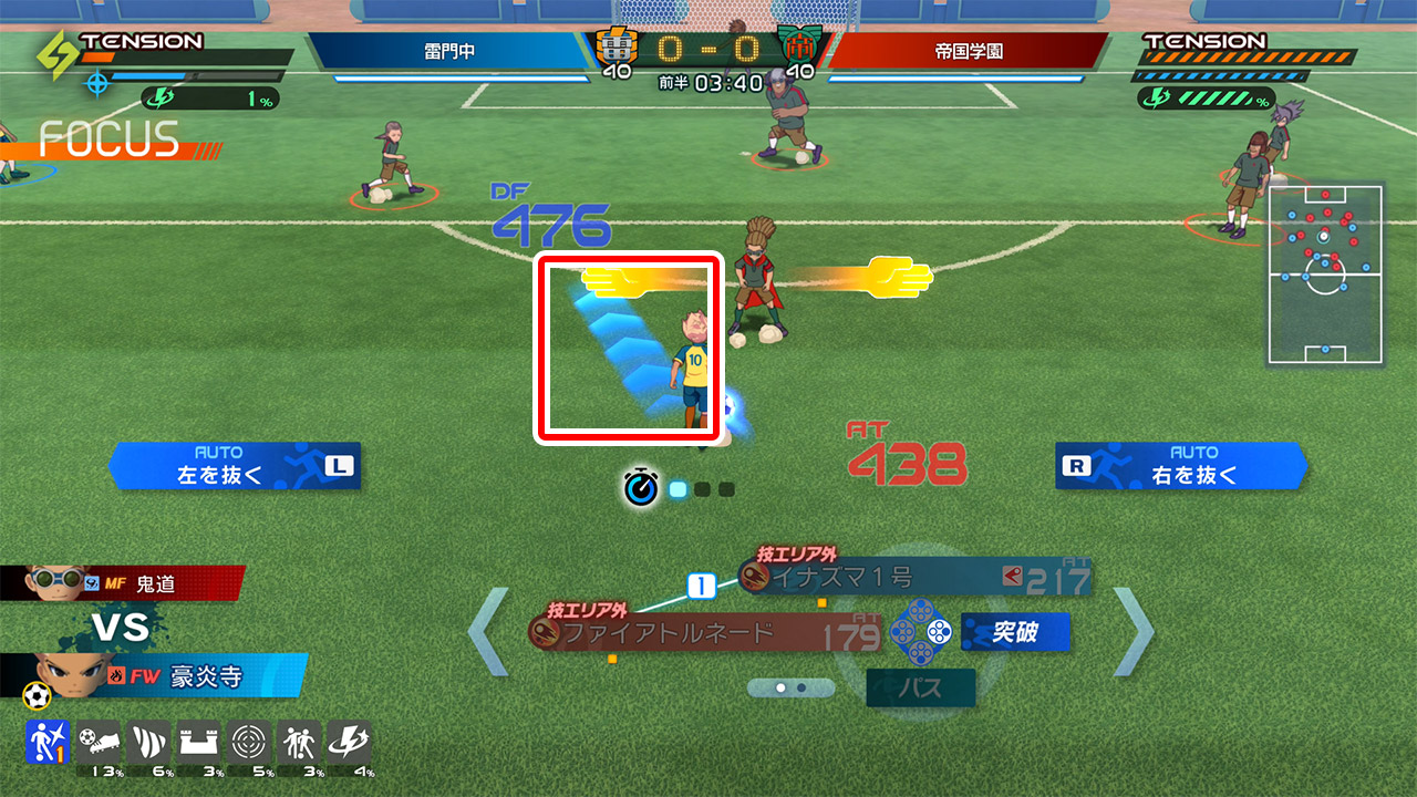 ●試合中のフォーカスにて、突破を行うと同時に反対の進行方向にスティックを倒すと、