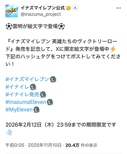 『イナズマイレブン 英雄たちのヴィクトリーロード』の発売を記念して、Xにてイナズマイレブン仕様のいいねと絵文字が実装されています。