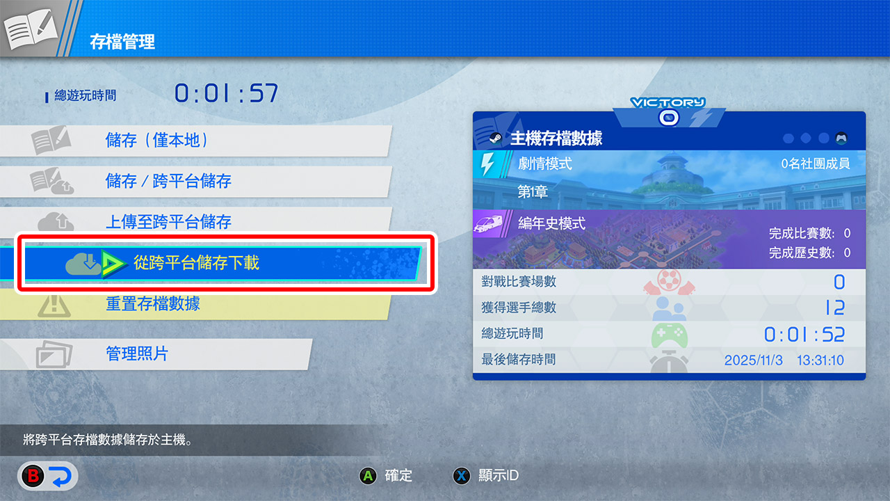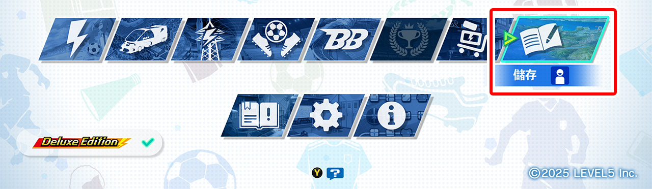 請在要進行跨平台共用存檔的平台中啟動《閃電十一人 英雄們的勝利之路》,並在標題選單中選擇「儲存」。
