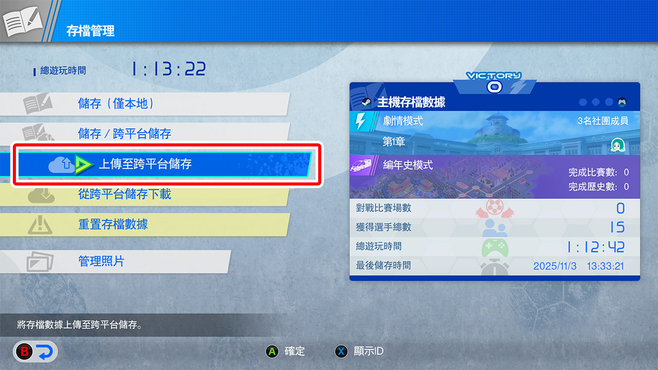 請在「存檔管理」選單中選擇「上傳至跨平台儲存」。
