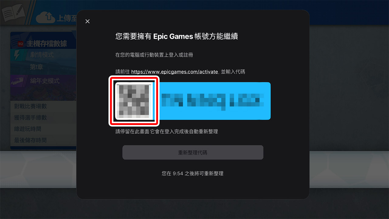 在裝置上透過QR碼進入的畫面完成登入後,會顯示帳號綁定的畫面。請依各平台的步驟綁定 Epic Games 帳號。