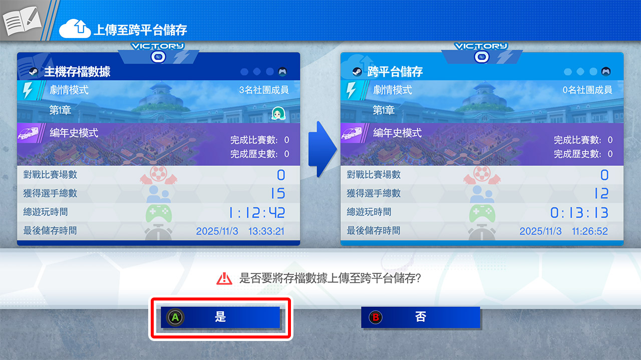 連結完成後,於「是否要將存檔數據上傳至跨平台儲存?」畫面中,長按顯示為「是」的按鈕。